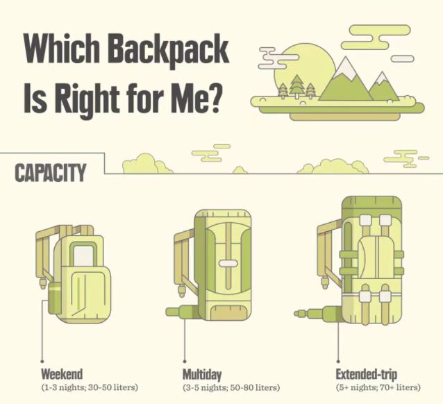 50 to 70L - these are multi-day backpacks for city breaks or short breaks (3 to 5 days), hiking, and camping;